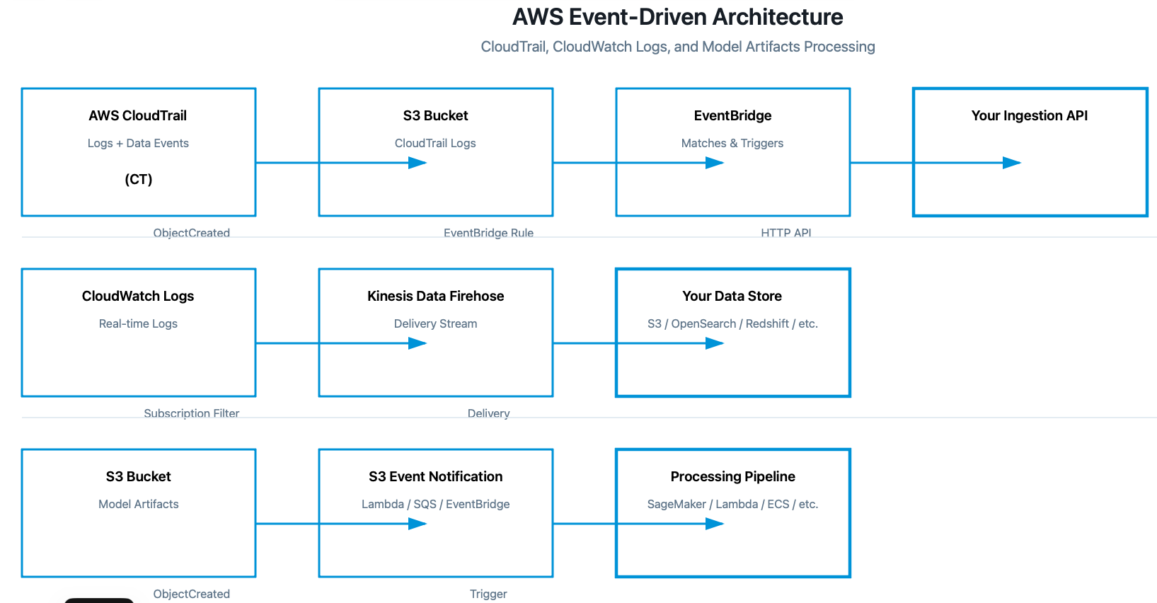 • CloudTrail → S3 bucket → EventBridge rule → Your ingestion API